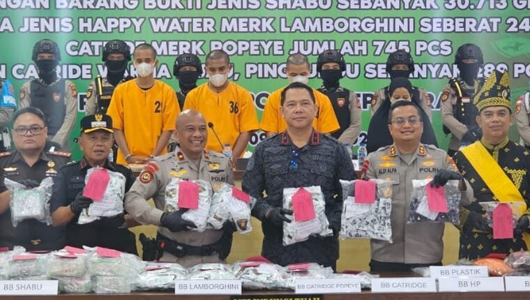 Barang bukti yang berhasil diamankan terdiri dari 30.713,7 gram sabu dalam kemasan teh hijau “Chinese Tea” dan 24.302,4 gram Happy Water Lamborghini.