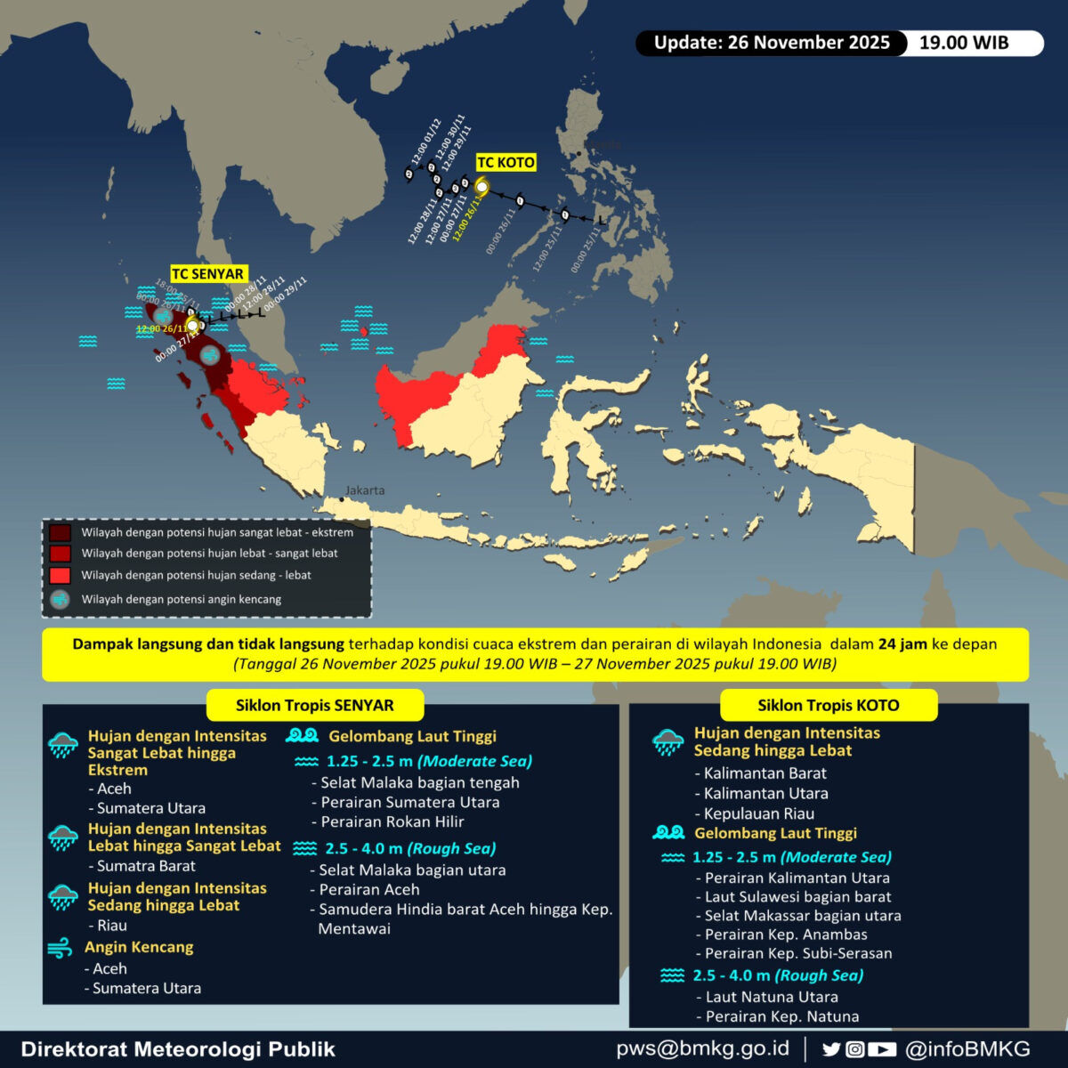 Berdasarkan pemantauan BMKG, Siklon Tropis SENYAR yang berada di sebelah barat daya Sumatra memicu hujan dengan intensitas sangat lebat hingga ekstrem di Aceh dan Sumatera Utara. Potensi hujan lebat hingga sangat lebat juga diperkirakan terjadi di Sumatra Barat.