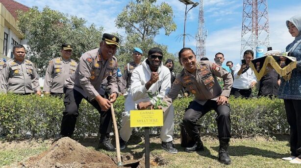 Dalam kesempatan itu, Melly Mike langsung ikut serta dalam aksi penghijauan dengan menanam pohon gaharu di halaman depan Mapolda Riau.