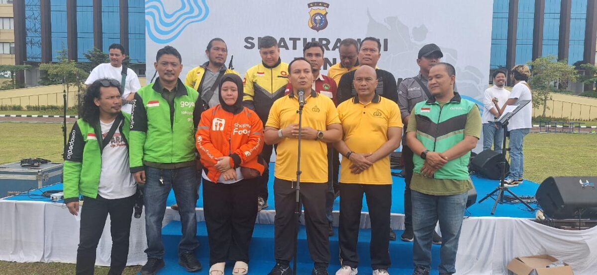 Kapolda Riau Irjen Pol Hery Heryawan bersama jajaran kompak berolahraga bersama ratusan driver online dari berbagai platform seperti Gojek, Grab, Maxim, hingga ShopeeFood.